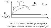 растет и появляется ООС (последовательная и по току), глубина которой тем больше, чем ниже частота (кривая 1). Если увеличить емкость СЭ, то ОС будет включаться позже (кривая 2), т.е. произойдет расширение полосы пропускания в сторону нижних частот.