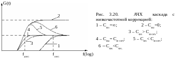 АЧХ для разных значений СФ изображены на рис. 3.20. При СФ= (кривая 1) резистор Rф закорочен по переменному току и мы получаем АЧХ обычного некорректированного каскада.