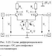 сли же ДК несимметричен, то в отсутствии входных сигналов, на выходе появляется конечное напряжение, которое изменяется во времени из-за воздействия на ДК различных ДФ. Это изменение называется дрейфом нуля выходного напряжения. Величину этого напряжения и его дрейф можно уменьшить введением ООС для синфазных составляющих (рис. 3.23). При действии СС одинаково увеличиваются эмиттерные токи iЭ1, iЭ2 и на сопротивление RЭ возникает напряжение RЭ(iЭ1 + iЭ2), которое через источники сигналов воздействуют на оба входа, вызывая уменьшение напряжения uБЭ=u1–RЭ(iЭ1+iЭ2), т.е. в схеме возникает последовательная ООС по току, которая уменьшает коэффициент усиления для СС. Если же на входы поступают ДС, то токи iЭ1 и iЭ2 протекают через RЭ в противоположных направлениях (рис. 3.23) и напряжение ОС uОС=RЭ(iЭ1–iЭ2)0, т.е. для полезного (ДС) сигнала ОС практически будет отсутствовать.