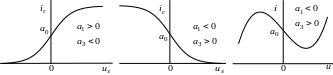 Определение коэффициентов аппроксимации для степенных функций целесообразно проводить методом выбранных точек. При этом неполный полином третьей степени (табл.8.1) описывает ВАХ с началом координат в центре симметрии (рис.8.15). Определение коэффициентов для экспоненциальных функций следует проводить методом приведения к линейному виду. Для кусочно-ломаной прямой параметры аппроксимации определяются графическим путем. Расчет гармоник тока следует провести соответственно с использованием тригонометрических формул кратных аргументов (для степенной аппроксимации), функций Бесселя (при аппроксимации синусом), модифицированных функций Бесселя (для экспоненциальной аппроксимации) и функций Берга (для кусочно-линейной аппроксимации). Значения функций Берга, обычных и модифицированных функций Бесселя приведены в прил. П.3, П.4.