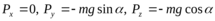 27. В конце конвейера имеется наклонная плоскость, на которую попадает деталь веса Р. Проекции силы тяжести на оси х, у, z (z — нормаль к наклонной плоскости) имеют следующий вид: