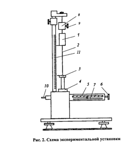 Модель копра состоит из груза 1, который может перемещаться по вертикальной направляющей 2, и сваи 3. Свая может скользить в имитирующей грунт разрезной втулке 4. Сила трения между сваей и втулкой создается за счет силы нормального давления N на одну из половин втулки со стороны пружины 5. Усилие пружины регулируется с помощью винта 6 и измеряется по шкале 7 динамометра. Для удержания груза 1 на некоторой высоте над сваей используется механический фиксатор 8, который можно перемещать по вертикали и закреплять в нужном положении стопорным винтом. Для закрепления груза его поднимают до срабатывания защелки фиксатора. Освобождение груза производиться нажатием пусковой кнопки 9 фиксатора. Свая 3 может быть легко освобождена от нагрузки с помощью рычага 10. Координаты груза и сваи до и после удара изменяются по шкале линейки 11 с помощью указателей, прикрепленных к грузу и свае.