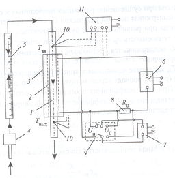 7. При достижении стационарного режима (не менее 10 мин после включения нагревателя и задания ) запишите в табл. 2 показания вольтметра и , а также показания расходомера в делениях. Во всех опытах расход не изменяется.