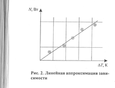 Поскольку теплоемкость идеального газа не зависит от температуры, а расход поддерживается постоянным, то в соответствии с (11) и прямо пропорциональны. Следовательно, построив график зависимости , мы вправе использовать линейную аппроксимацию этой зависимости (рис. 2), проводя усредняющую прямую по экспериментальным точкам. При этом коэффициент пропорциональности между и есть произведение . Коэффициент этой аппроксимации можно легко определить графически по соотношению