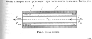 Пусть через трубку 1 (рис. 1) течет газ (или жидкость), и при этом через стенки трубки к системе подводится тепло . Тогда газ при течении через трубку будет нагреваться и его температура на выходе окажется больше, чем на входе . Так как канал имеет небольшую длину и достаточно большое сечение, то течение обеспечивается малым перепадом давления газа между входом в трубку и выходом из нее . Этот перепад давления намного меньше абсолютного значения давления в системе и поэтому можно считать, что течение и нагрев газа происходят при постоянном давлении.