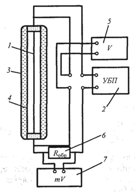 Вольфрамовая нить 1, нагреваемая постоянным током от универсального блока питания (УБП) 2, натянута вдоль оси симметрии цилиндрического стеклянного баллона с двойными стенками 3 (рис.1). Между стенками баллона залита вода, которая поддерживает температуру трубки 4 практически постоянной благодаря своей высокой теплоемкости. Напряжение на нити измеряется цифровым вольтметром 5. Разность потенциалов на образцовом резисторе 6 измеряется милливольтметром 7 (вольтметр 5 и милливольтметр 7 могут быть совмещены в одном приборе — мультиметре).