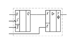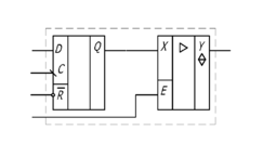 D триггер с выходом с тремя состояниями представляет собой объединение триггера и выходного буферного элемента, реализующего выход с тремя состояниями.