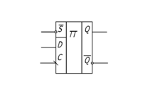 Сигнал на выходе Q D-триггера соответствует сигналу на входе D в момент появления заднего фронта синхроимпульса С и появляется на выходе Q с задержкой tP1 нс. Сигнал на входе D должен появиться раньше, чем фронт синхроимпульса С на время, превышающее время предустановки tCU. Этот сигнал должен сохранять свое значение на входе D в течение времени, превышающем время удержания tH.