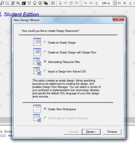 Мастер нового проекта (New Design Wizard) позволяет создавать Новые Файлы Проекта, содержащие шаблон для создания VHDL описания проекта на основе информации, вводимой в диалоговом режиме в процессе дальнейшей работы с мастером. Кроме того, имеется возможность добавлять (Add) в проект ранее созданные файлы, в частности файлы из других проектов.
