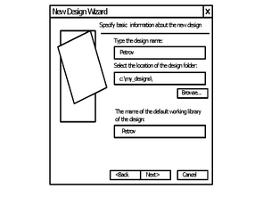 В учебных целях в качестве заголовка проекта следует набрать фамилию студента в верхнем окошке (набрано Petrov) и уточнить расположение рабочей папки во втором окошке (папка C:\My_Designs на диске) .