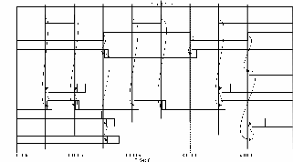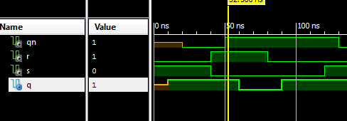 Ниже временная диаграмма модели триггера, на которой видно , что задержка элемента 2И-не принята =10 нс, входные сигналы меняются каждые 40 нс, начальное состояние сигналов триггера неопределенное и потом изменяется на 0 и 1.