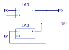 Активными уровнями сигналов R и S на входе являются низкие уровни. Запрещенным состоянием является R = 0 и S = 0. По такой схеме выпускается отечественная микросхема RS-триггера КР1533ТР2. Ниже вариант реализации схемы RS-триггера на элементах микросхемы ЛА3 (2И-НЕ), рисунок схемы выполнен с помощью схемного редактора САПР ISE