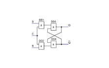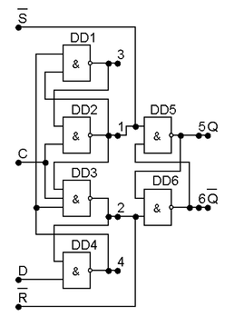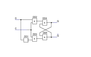 В этой схеме хранение информации происходит в выходном RS-триггере (элементы DD5 и DD6) с инверсными сигналами на входах.