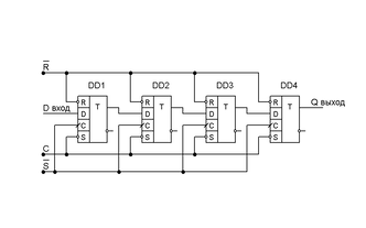 Информационный импульс поступает на D вход левого триггера DD1 и по фронту импульса синхронизации записывается в этот триггер, оказываясь тем самым на D входе второго триггера DD2. Следующий импульс синхронизации сдвигает этот импульс еще на один разряд вправо.