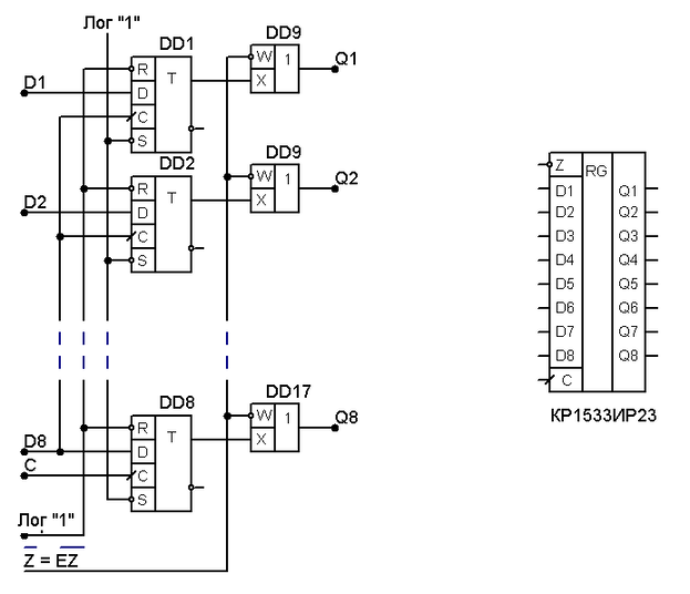 Входное 8-ми разрядное число подается на входы D1 – D8, запись числа в регистр происходит по фронту синхросигнала С. Активный сигнал на входе разрешения выхода EZ открывает буферные элементы с тремя состояниями, в результате чего записанное число появляется на выходы Q1 – Q8.