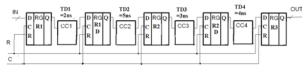 На рис.5.7.представлена некоторая трехкаскадная конвейерная схема. Блоки ее комбинационной части CC1,CC2.CC3,CC4 ( СС-Combinatorial circuit) имеют разные задержки, обозначенные как TD1=2нс.,TD2=5 нс., TD3=3 нс.,TD4=4 нс.