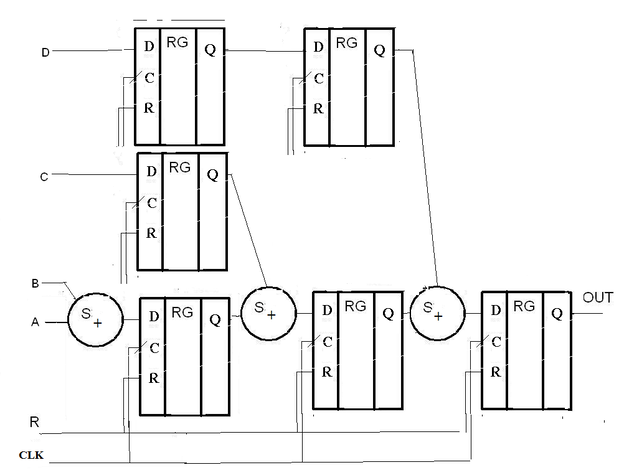 S=A+B+C+D. Вариант последовательного сложения представлен на рис.5.4. Схема использует один сумматор и регистр и требует четырех тактов на выполнение операции. Tсл_послед= 4*ТD=20 ns, где ТD включает задержку на сумматоре и на регистре . После обнуления регистра сигналом сброса R.