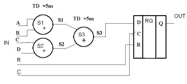 Рис.5.6.Конвейерный вариант вычисления суммы четырех слагаемых (Tсл_конв= TD=5 ns)