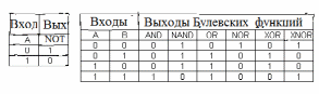 Ниже в табл.1. 1 представлены Булевские таблицы истинности логических операций (элементарных логических функций): НЕ(NOT-инверсия), И (AND- конъюнкция,), И-НЕ (NAND- конъюнкция с инверсией), ИЛИ(OR- дизьюнкция), ИЛИ-НЕ(NOR- дизьюнкция с отрицанием),