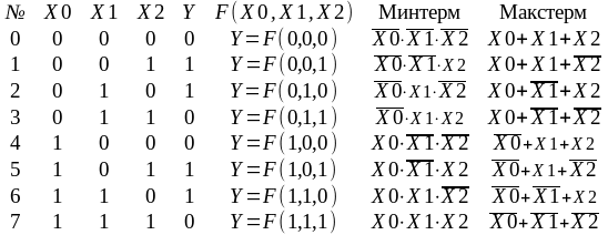 Таблицы истинности логической функции содержат минтермы и макстермы. Рассмотрим пример логической функции F от трех переменных с аргументами X0, X1, X2 и значением Y, заданной в виде таблицы истинности, приведенной в таб. 1.2.