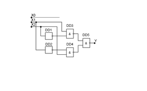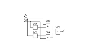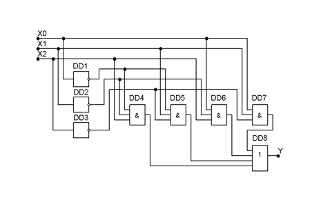 Схемотехническая реализация на элементах НЕ, И и ИЛИ. Каждому минтерму в канонической дизъюнктивной форме логической функции ставим в соответствие логический элемент И с необходимым числом входов. Выходы этих элементов объединяем при помощи логических элементов ИЛИ. Инверсию входных сигналов обеспечивают инверторы. Такая трехуровневая реализация логической функции не оптимальна. В ней, во-первых, применяется излишнее число элементов И. Во-вторых, задержка распространения сигналов в элементах И и ИЛИ обычно больше, чем в элементах И-НЕ и ИЛИ-НЕ.
