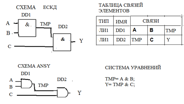 Обычно под схемой цифрового устройства, как уже указывалось выше, понимают графическую форму, содержащую имена входных и выходных сигналов , УГО элементов и отображение их связей. Схемы можно так же описывать используя другие формы–например табличные, алгебраические, HDL описания и т.д. На рис.1.9 представлены графический и табличный способы описания схемы, реализующей логическую функцию 3И ( Y= A & B & C) на элементах 2И (микросхема ЛИ1) ,