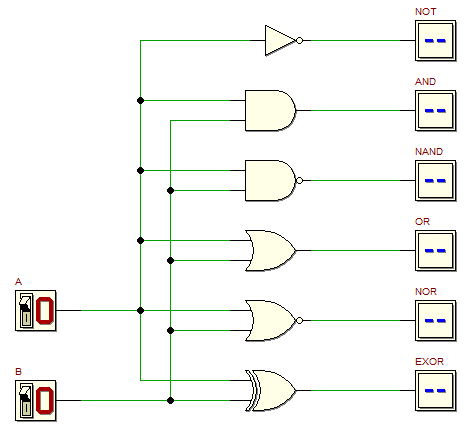 на панели инструментов программы d-DcS. Теперь вы можете изменять состояние переключателей входных сигналов A и B и выходы логических вентилей будут изменяться соответственно.