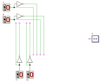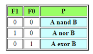 Разработать схему, реализующую программируемый логический вентиль.Слово программируемый следует понимать как вентиль, функция которого может меняться настройкой. Схема имеет четыре входа A, B, F1, F0 и выход P. Схема может настраиваться на реализацию логических функций NAND, NOR, EXOR от A и B, в зависимости от значений управляющих сигналов F1 и F0. Управляющие сигналы и соответствующие им функции представлены в таблице
