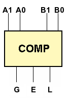 Условное графическое отображение двухразрядного двоичного компаратора показана на фигуре ниже. Компаратор сравнивает два двоичных числа A и B ( A1, A0 и B1, B0) и генерирует три выходных сигнала : G, E и L. Выход G (Больше) устанавливается в «1» если A > B; выход E (Равенство) устанавливается в «1» если A = B; выход L (Меньше) устанавливается в «1» если A < B.