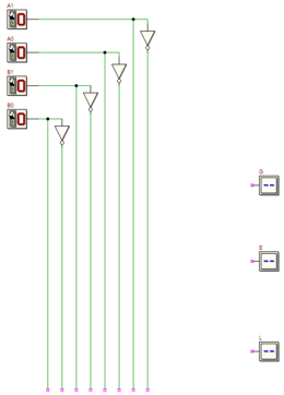 Составьте таблицу истинности функции двоичного компаратора. Запишите СДНФ и постройте минимизированную логическую функцию для каждого выхода ( в базисе И-ИЛИ-НЕ). Постройте модель схемы по таблице истинности, используя подготовленный ниже шаблон в программе d-DcS