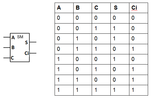 В качестве примера из области проектирования комбинационных схем рассмотрим проектирование схемы одноразрядного двоичного сумматора. На рис. представлены его УГО и таблица истинности логической функции , где А, В, С- входы, S- выход суммы, Ci-перенос в следующий разряд.