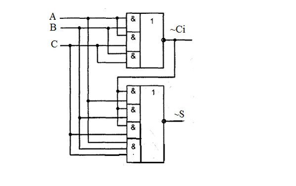 Если без минимизации, прямо по формулам 1 строить схему сумматора и использовать экзотический элементный базис, включающий вентили 3И с различными инверсными входами( они реализуют коньюнкции с тремя входами ,часть из которых инвертирует входной сигнал) и 4ИЛИ( они реализуют четырехвходовую дизьюнкцию), то получится двухкаскадная схема (общее для S и Ci выражение ( A&B &C) в схеме не дублируется в целях минимизации оборудования) , состоящая из семи вентилей 3И( некоторые их входы инверсны ) и двух 4ИЛИ.