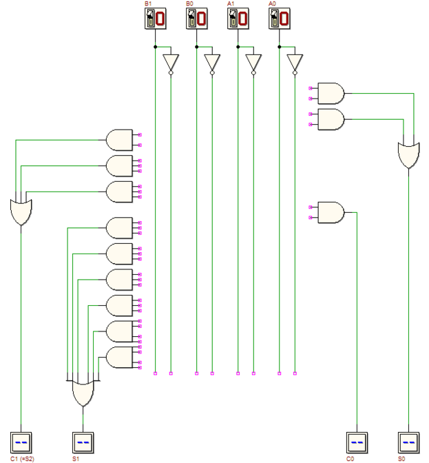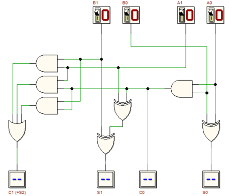 После этого проведите синтез схемы по таблице истинности( получив СДНФ) и реализуйте ее как двухярусную( двух уровневую) схему в логическом базисе AND-OR , строя ее как быстрый двухразрядный сумматор .Быстрый относится к тому факту, что это будет двухярусная схема и время распространения сигнала от входа к выходу будет меньше, чем в исходной схеме. ( Еще больший выигрыш от такого способа построения сумматора будет получен при увеличении его разрядности- естественно,затраты оборудования тоже резко возрастают с увеличении разрядности такого сумматора).