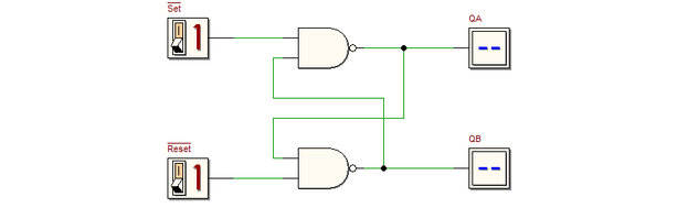 Обратите внимание, что надо включать в тест особый случай, где R и S сначала оба =0, а потом оба =1 (переход 0-1)изменяются точно одновременно. Попытайтесь объяснить, почему схема в этом случае показывает стабильное автоколебание, и почему этого не может произойти в 'реальном мире'.