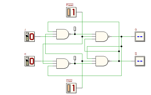 Используя временное моделирование , исследуйте поведение схемы. Обратите внимание на два установочных входа( Установка и Сброс PRESET,CLEAR). Вы должны в тесте перебрать все возможные комбинации входов J и K после предварительной установки триггера в 0 или 1. Рассмотрите особый случай, когда J и K будут активны(=1) одновременно.