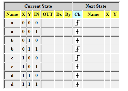 Используя таблицу состояний постройте КАРТУ КАРНО для выходов OUT и переменных Dx,Dy которые определяют входы триггеров состояний автомата X,Y.