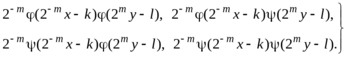 Однако на практике поступают проще. Многомерный и, в частности, двумерный КМА строят как тензорное произведение одномерных КМА. При таком подходе отцовский и материнский вейвлеты будут сформированы следующим образом: