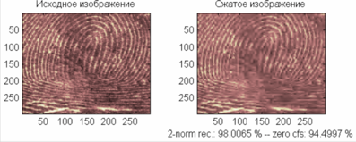 На рис. 3.7 приведены исходный и сжатый отпечатки пальца; при этом более 94 % коэффициентов обнулено, а в оставшихся сосредоточено 98 % от энергии всех коэффициентов разложения. Несмотря на то, что сжатие осуществлено в десятки раз, качество изображения остается вполне хорошим. Поэтому объем архива отпечатков пальцев для криминалистических отделов может быть существенно уменьшен.