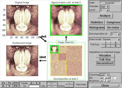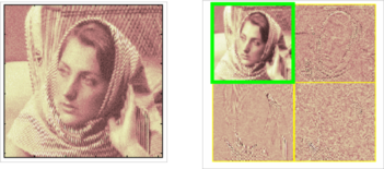 И еще следует отметить, что принципиальное отличие процедуры компрессии с помощью ДВП от широко распространенного сжатия по стандарту JPEG состоит в том, что она работает со всем изображением, в то время как в JPEG изображение разбивается на блоки, которые сжимаются независимо. В случае ВП можно подобрать такую базисную вейвлет-функцию, которая адаптирована к наиболее информативным особенностям изображения. Здесь адаптивность понимается в том смысле, что элементы или участки изображения с довольно плавным изменением яркости представляются небольшим числом вейвлет-коэффициентов.