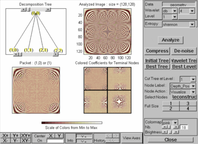 Для двумерного ВП могут также успешно использоваться пакетные вейвлеты. Рис. 3.4 демонстрирует пример такого рода. В левой части окна приведены четыре изображения: вейвлет-дерева первого уровня (верх слева), анализируемого изображения (верх справа), изображения в узле (1,0) (низ слева) и пакетного разложения (низ справа). Меню в правой части окна позво-ляет выбирать различные типы дерева, проводить анализ (декомпозицию), очистку от шума и компрессию изображения.
