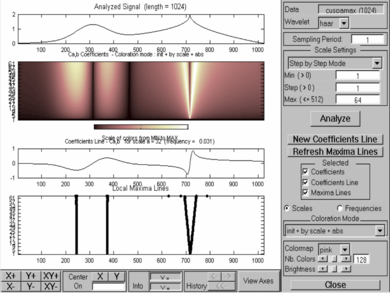 ) и линии выделения экстремумов (Local Maxima Lines). Кнопки правой части позволяют выбрать тип и порядок вейвлета и соответствующие параметры вейвлет-технологии. Пользуясь опциями Selected Axes, можно вывести лишь часть графиков, например один, но в укрупненном масштабе.