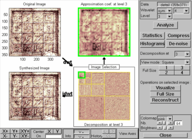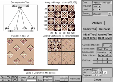 окно дает возможность просмотра любого фрагмента декомпозиции, выделенного мышью с последующим щелчком на кнопке Visualize. Кнопки Full Size иReconstruct позволяют вывести в максимальном размере соответственно исходное и реконструированное изображение. Остальные элементы управления в правой части окна аналогичны таковым для окна Wavelet 1-D.
