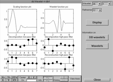 Wavelet Display – просмотр вейвлетов. Нажатие этой кнопки выводит окно, в котором слева расположено основное поле для графиков, а справа – подменю управления, в котором имеются кнопки для выбора типа вейвлета и получения необходимых сведений о нем.