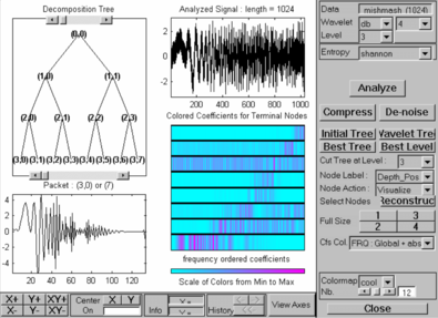 в узле (3.0) (Packet: (3,0)), получаемый активизацией этого узла дерева; анализируемый сигнал (Analyzed Signal); а под ним коэффициенты (Colored Coefficient …).