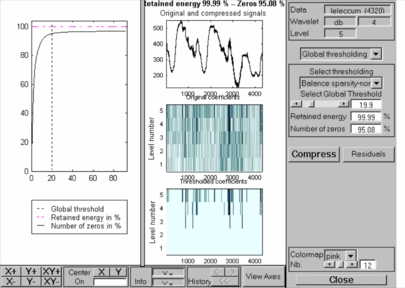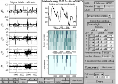 Сompress. Это окно компрессии (сжатия) выбранного сигнала В правой части окна можно указать способ компрессии: с глобальным порогом (Global thresholding ) или c локальными порогами (By level thresholding – рис. П.6) и выставить пороги. Для глобального порога (рис.П.5) можно задать его тип (Select thresholing): Scarce high-Scarce medion – Scarce Low – Belance sparsity-nrm – Remore near 0. Для локальных порогов (рис. П.6) можно установить свой порог (ползунковым регулятором) по каждому из коэффициентов. На диаграммах коэффициентов