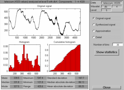 Statistics. Эта кнопка открывает окно с данными статистики – обычной и комулятивной гистограммами. Соответствующими кнопками устанавливается объект анализа: исходный сигнал (Original signal), синтезированный сигнал (Synthesized signal), коэффициенты аппроксимации (Approximation), детализирующие коэффициенты (Deteil). Для коэффициентов устанавливается также уровень level. На рис. П.4 приведен сигнал (соответствующий рис. П.3) и его гистограмма и комулятивная гистограмма. Под гистограммами приведены значения основных параметров статистического анализа.