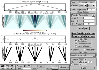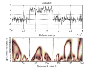 Пакет Wavelet Toolbox системы MATLAB располагает средствами для построения вейвлет-спектров сигналов с улучшенной визуализацией. Спектрограммы представляют значения вейвлет-коэффициентов в плоскости масштаб–время; при этом внизу спектрограммы расположены малые значения масштаба (малые номера коэффициентов), представляющие детальную картину сигнала, а вверху – большие значения
