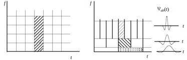 Недостаток оконного ПФ состоит в том, что используется фиксированное окно и, следовательно, фиксированное разрешение по времени и частоте для всех точек плоскости преобразования (рис. 1.18, а), которое не может быть адаптировано к локальным свойствам сигнала.