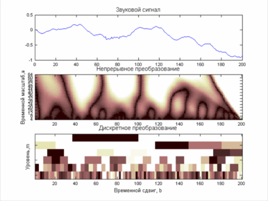 Загрузим звуковой сигнал из файла mtlb с выборкой в 200 отсчетов (см. пример 1.7) и построим его график и две спектрограммы – непрерывного и дискретного ВП: