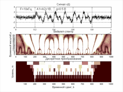 ) анализа (декомпозиции) и синтеза (реконструкции) сигнала. Такое представление каждой составляющей сигнала вейвлетами можно рассматривать как во временной, так и в частотной областях. В этом суть кратномасштабного анализа (КМА). В прил. 3 описан КМА для непрерывных сигналов.